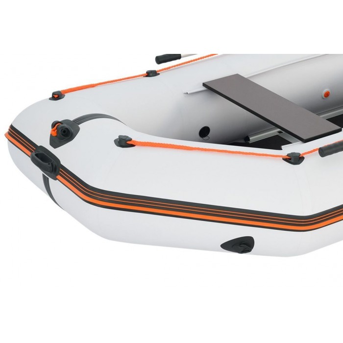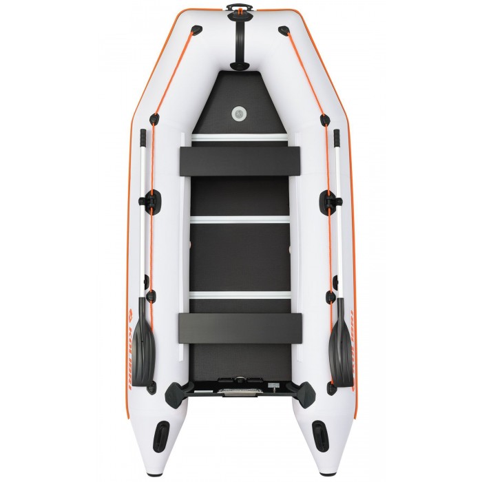 Одной из особенностей этой лодки является ее уникальный гидродинамический дизайн, который обеспечивает высокую плавучесть. Надувной киль повышает устойчивость и способствует экономии топлива за счет достижения режима глиссирования. Защитный брус шириной 6 см укрепляет киль и делает лодку более устойчивой при маневрах и встречном ветре. Важно отметить наличие весел с улучшенными гидродинамическими характеристиками и носового роульса с креплением для якорного каната, что делает эту лодку незаменимой для плавания в самых разных условиях.