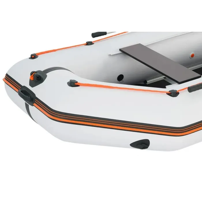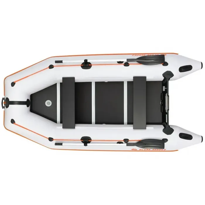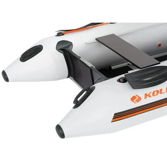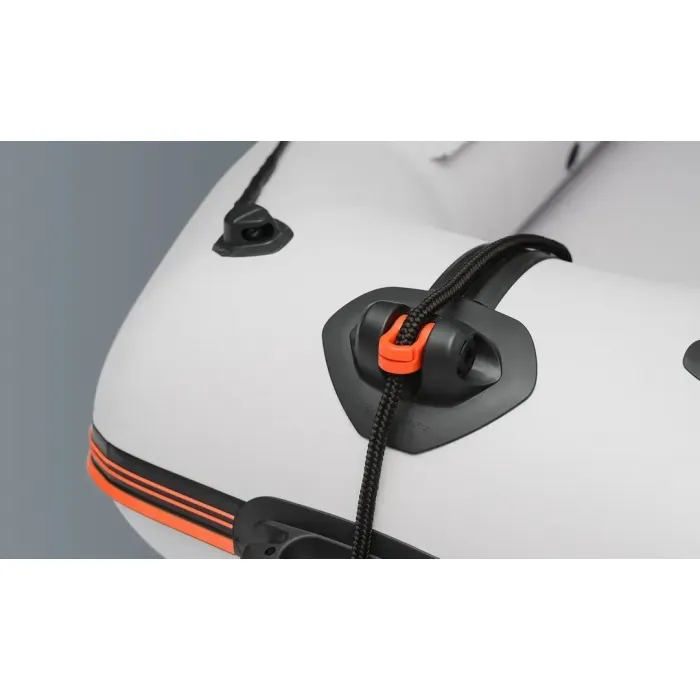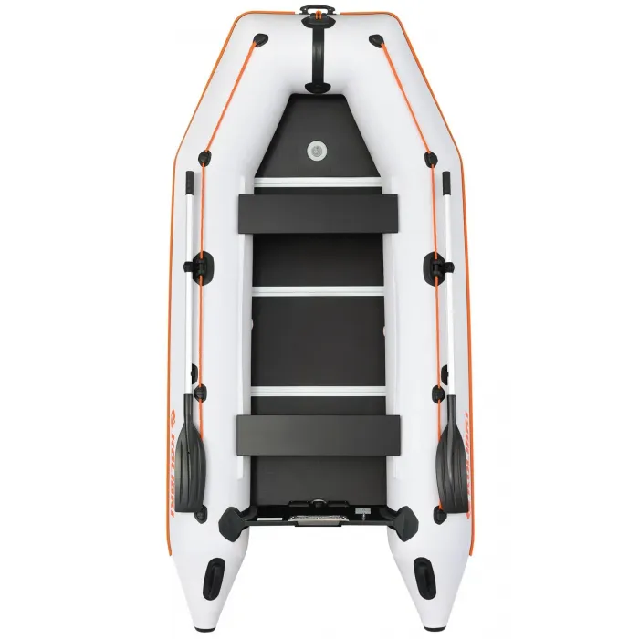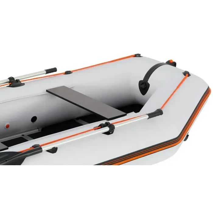 Одной из особенностей этой лодки является ее уникальный гидродинамический дизайн, который обеспечивает высокую плавучесть. Надувной киль повышает устойчивость и способствует экономии топлива за счет достижения режима глиссирования. Защитный брус шириной 6 см укрепляет киль и делает лодку более устойчивой при маневрах и встречном ветре. Важно отметить наличие весел с улучшенными гидродинамическими характеристиками и носового роульса с креплением для якорного каната, что делает эту лодку незаменимой для плавания в самых разных условиях.